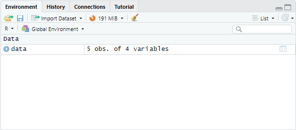 - Les bases de données peuvent être créées dans l’environnement sauvées dans l’environnement R. Ces fichiers ont une extension .RData
